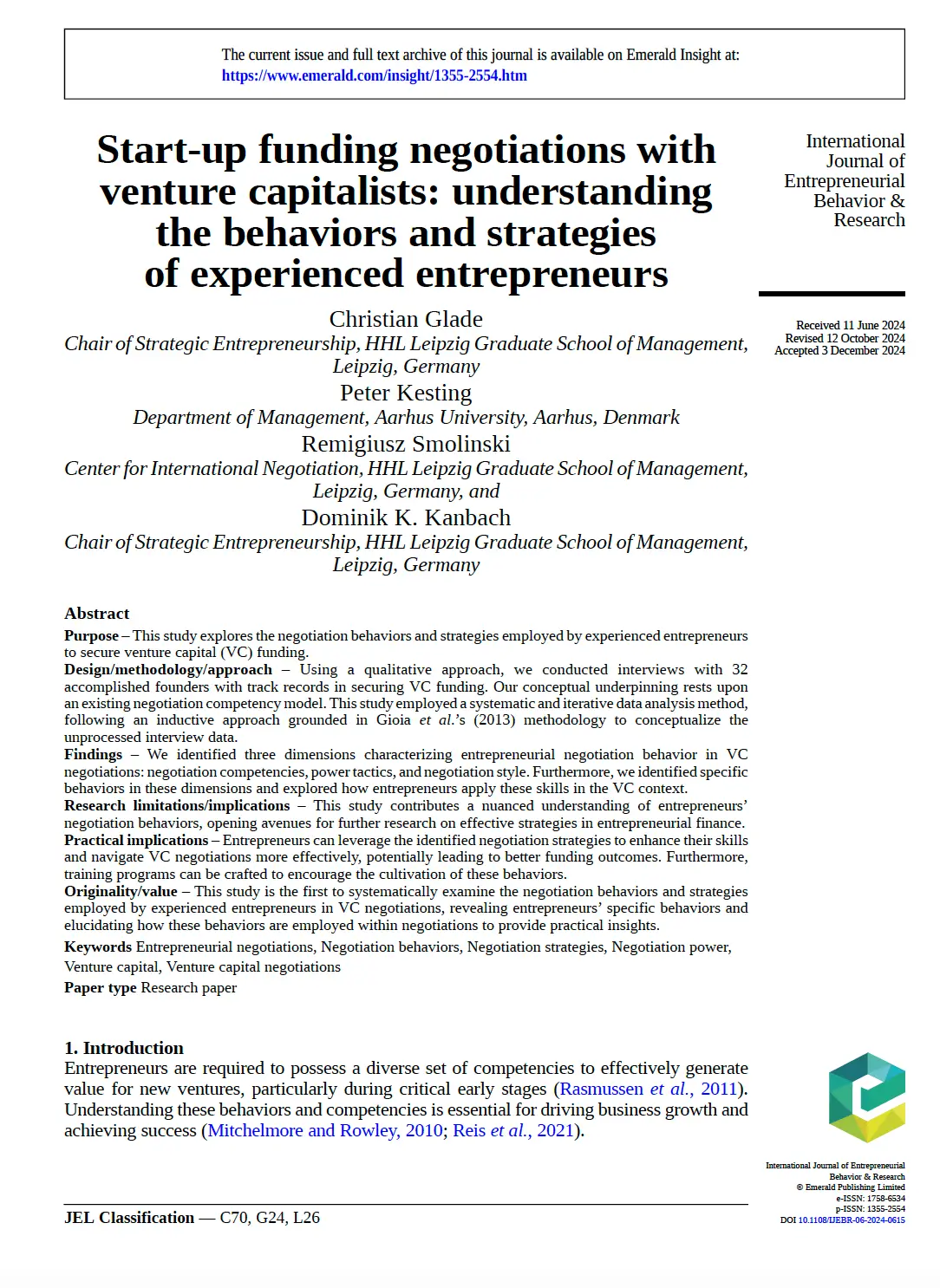 Start-up funding negotiations with venture capitalists: Understanding the behaviors and strategies of experienced entrepreneurs“, International Journal of Entrepreneurial Behavior & Research. https://doi.org/10.1108/IJEBR-06-2024-0615